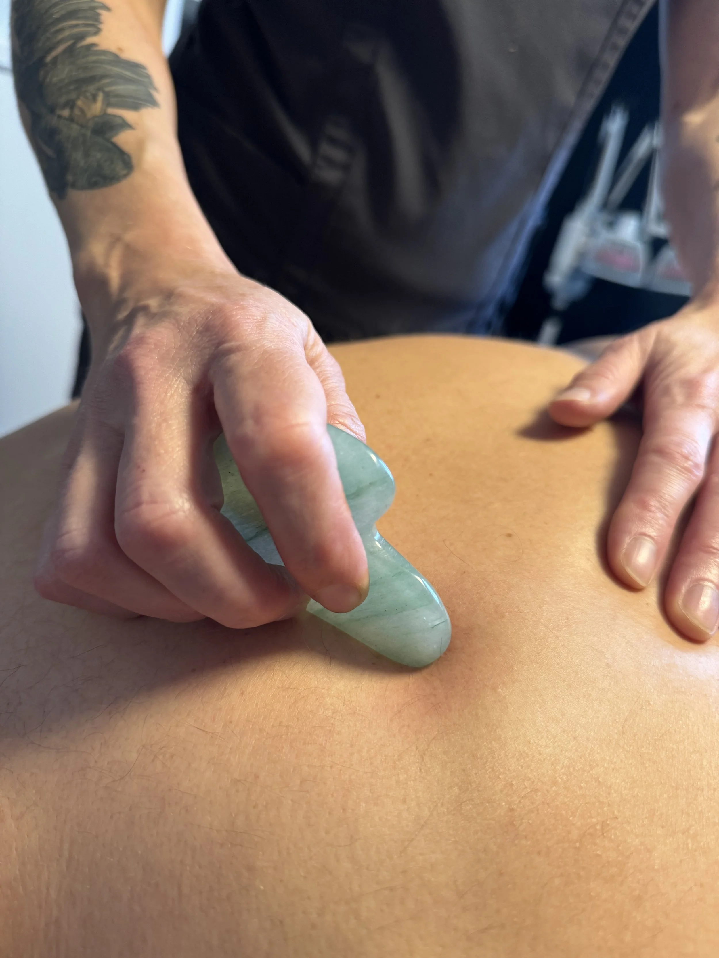 Gua means “scrape” and sha means “red spots”. A small blunt tool is used with oil to scrape along the skin, which leaves the characteristic red “Sha” marks, which are an indication of pathogens leaving the body. This strengthening and stimulating treatment can leave marks on the skin, again for up to about a week depending on how much sha needs clearing. This treatment improves microcirculation to the are being treated and is also a useful diagnostic tool.